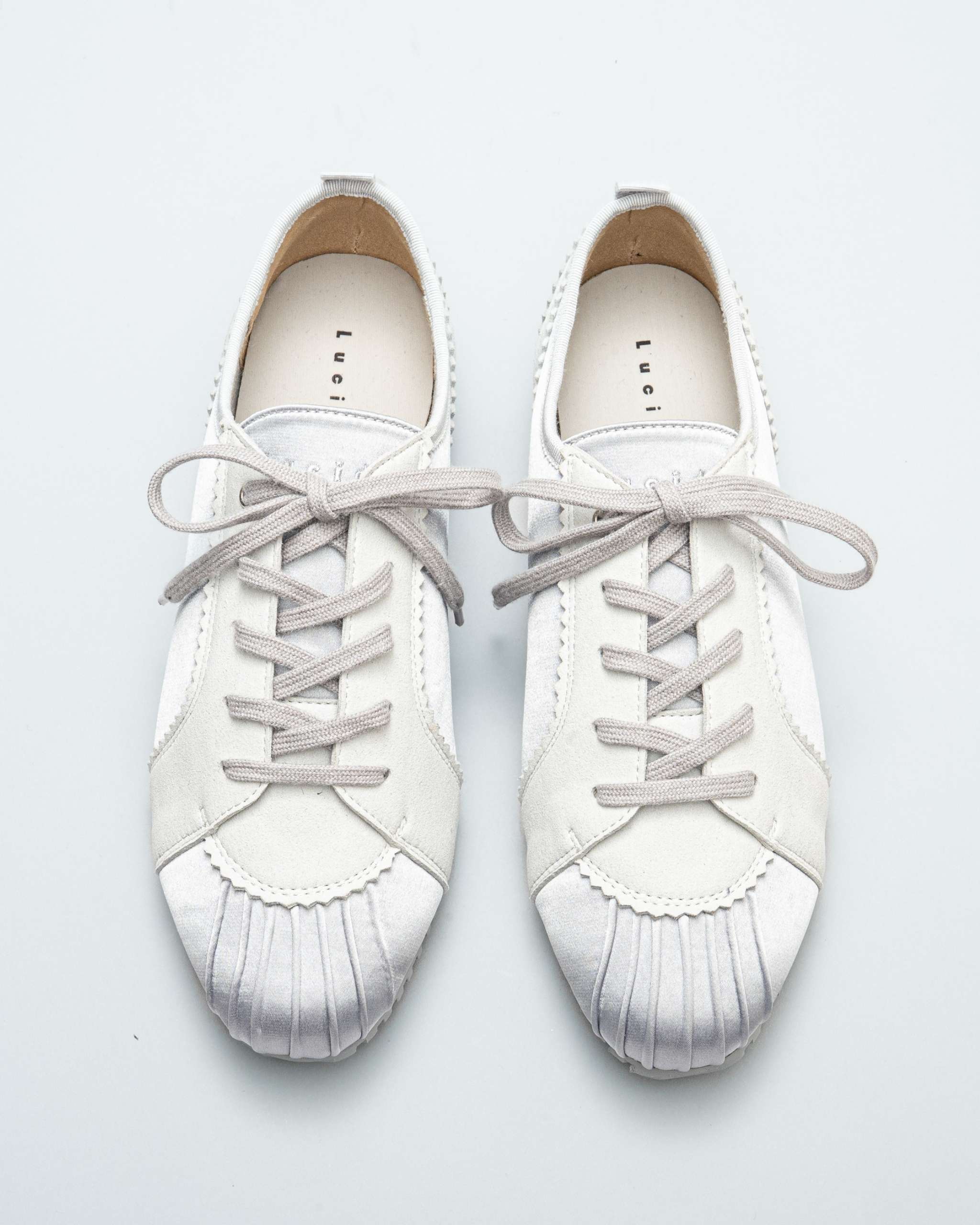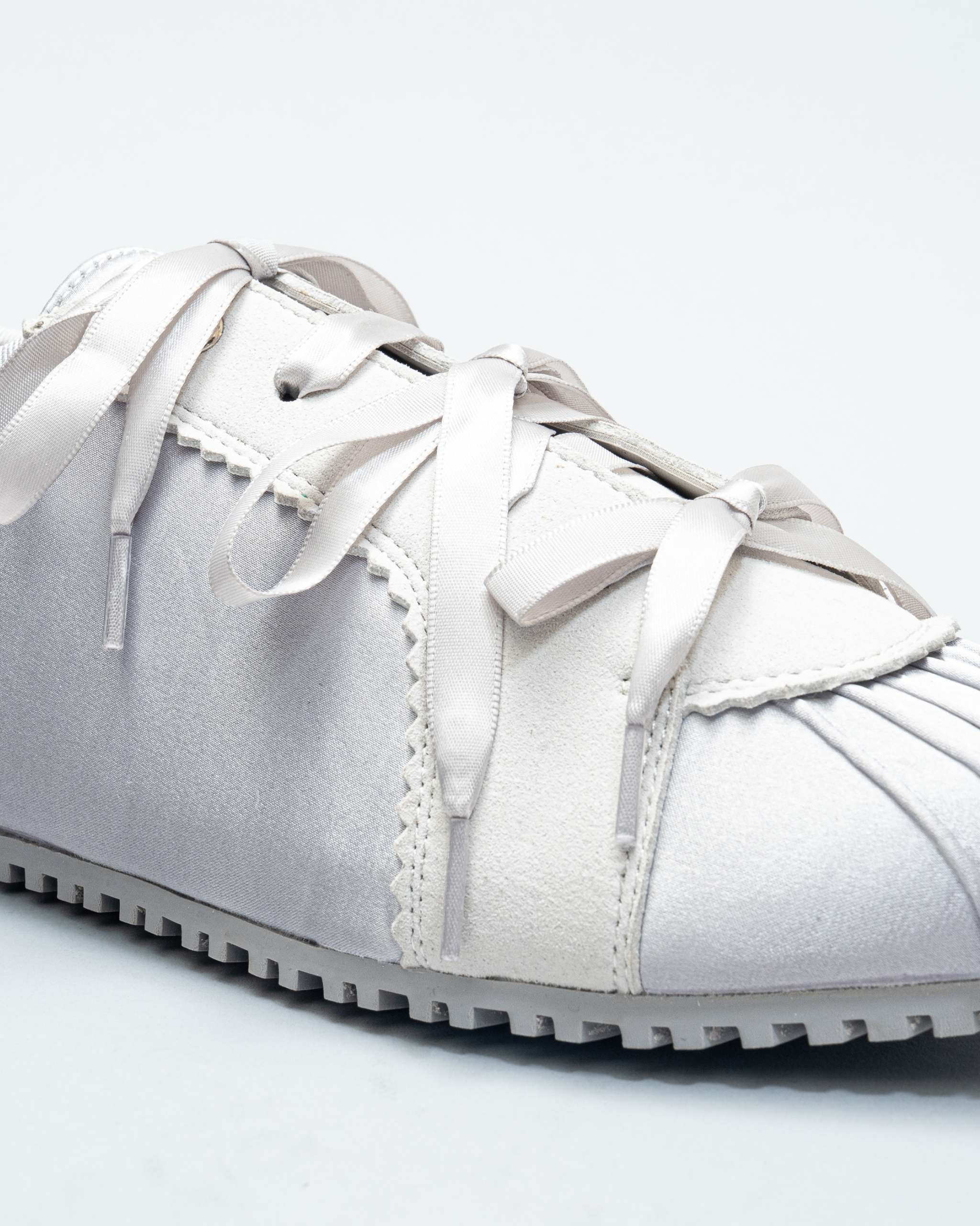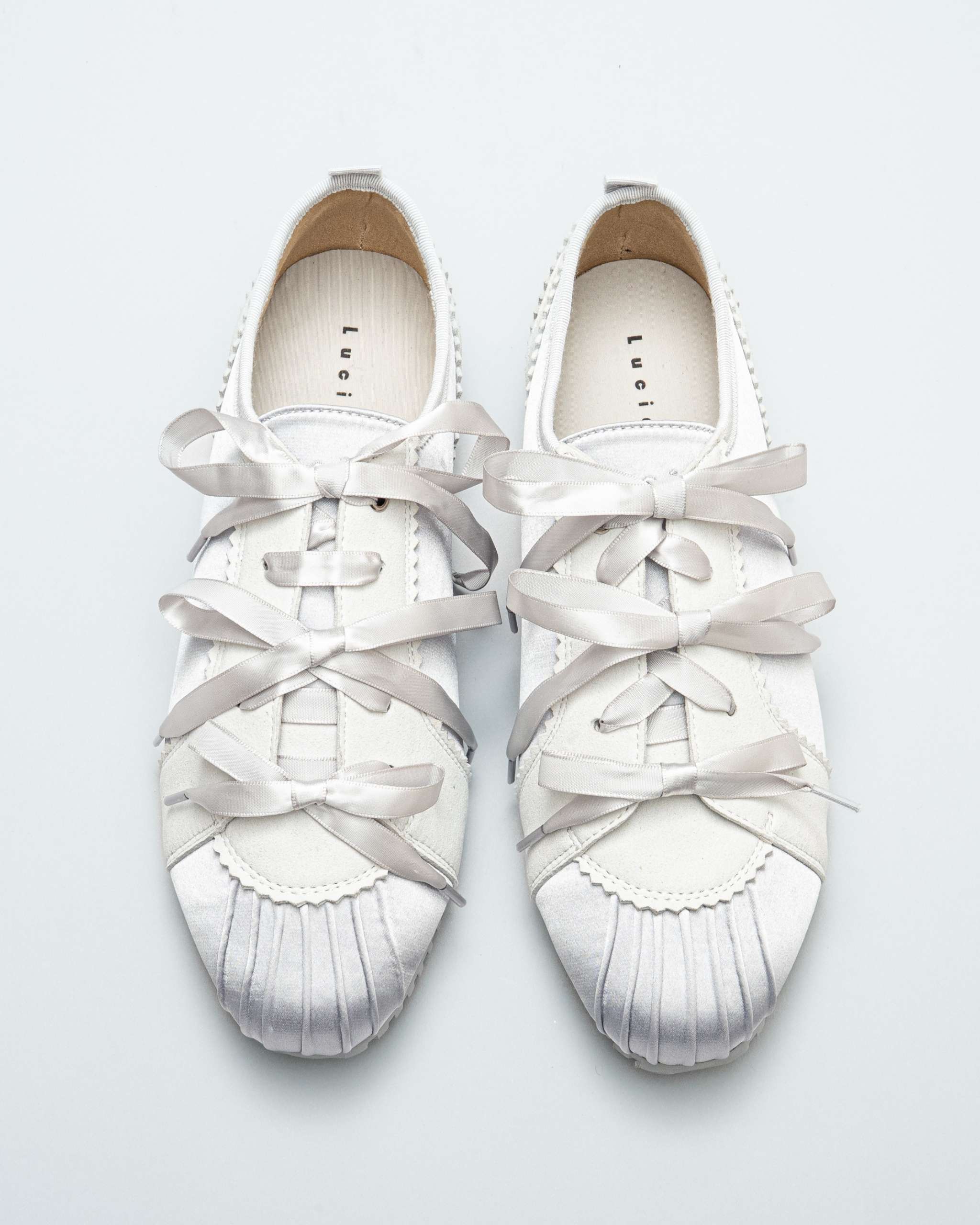 サテンの光沢とリボンディテールが織りなす、洗練された一足。女性らしい華やかさと、スニーカーならではの軽やかさを両立しました。カジュアルからドレススタイルまで、幅広いシーンに馴染む万能スニーカーです。付属のベーシックな靴紐に変えれば、大人カジュアルにも。