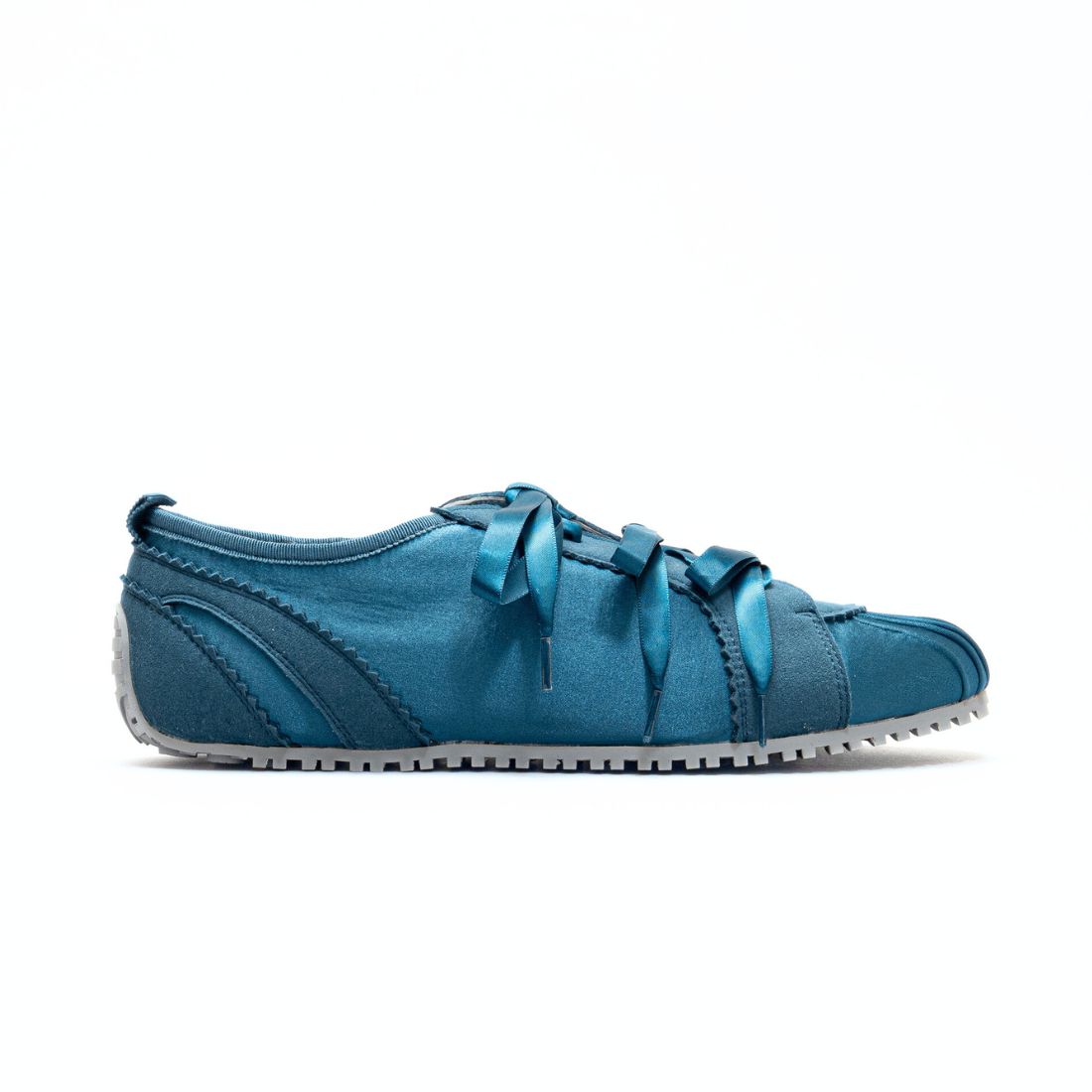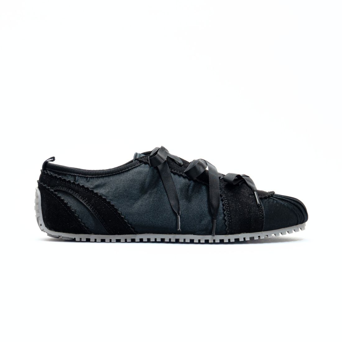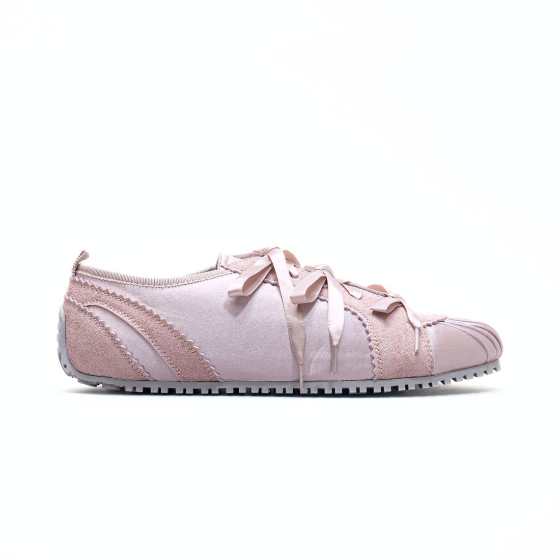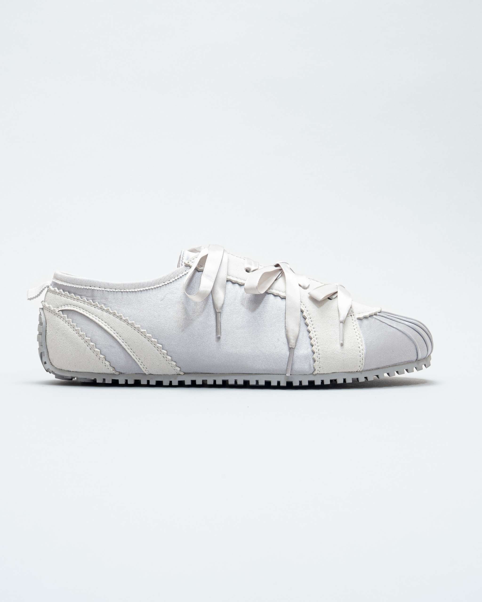 サテンの光沢とリボンディテールが織りなす、洗練された一足。女性らしい華やかさと、スニーカーならではの軽やかさを両立しました。カジュアルからドレススタイルまで、幅広いシーンに馴染む万能スニーカーです。付属のベーシックな靴紐に変えれば、大人カジュアルにも。
